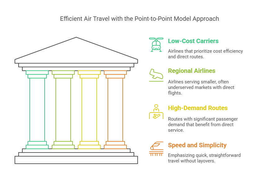 Use Case: This model is frequently used by low-cost carriers (LCCs) and regional airlines. It’s ideal for high-demand, short-haul routes where passengers value speed and simplicity over connection options.