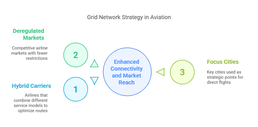Use Case: Grid networks are favored by hybrid carriers and airlines in deregulated, competitive markets that target underserved or niche city pairs.