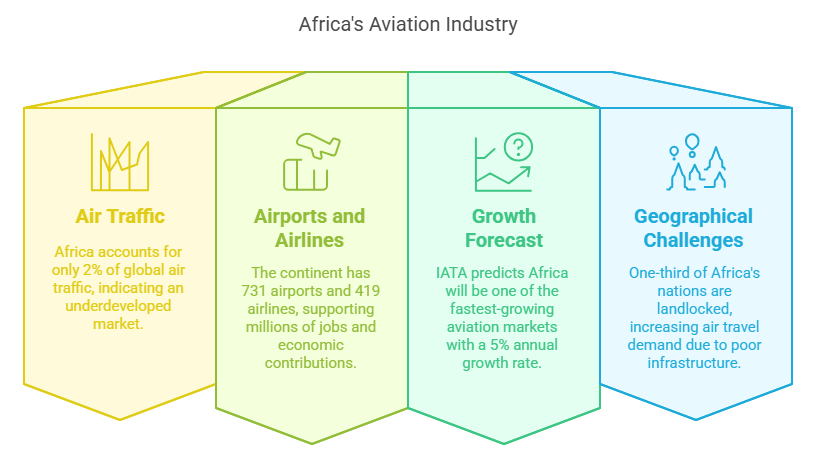 - Africa accounts for only 2% of global air traffic, reflecting its underdeveloped market compared to other regions.