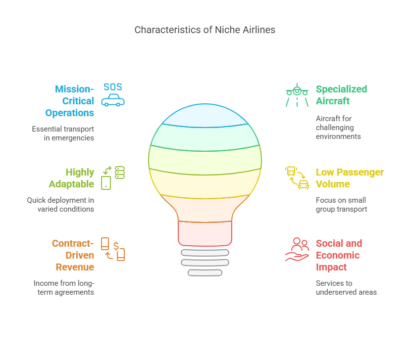 Niche or specialty airlines serve very specific markets or mission-critical functions that are underserved or overlooked by larger commercial carriers. These airlines typically operate in low-density, remote, or high-risk environments, fulfilling essential roles such as humanitarian relief, medical evacuation, disaster response, or government contracting.