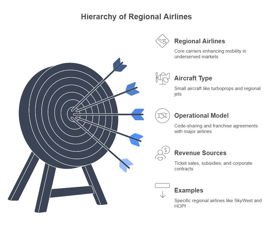 Regional airlines may operate under a partner brand (e.g., United Express, Delta Connection) but are typically independent companies. Their smaller scale allows for lower operational costs and flexible scheduling, though they often rely heavily on subsidies and parent airline agreements to remain profitable.
