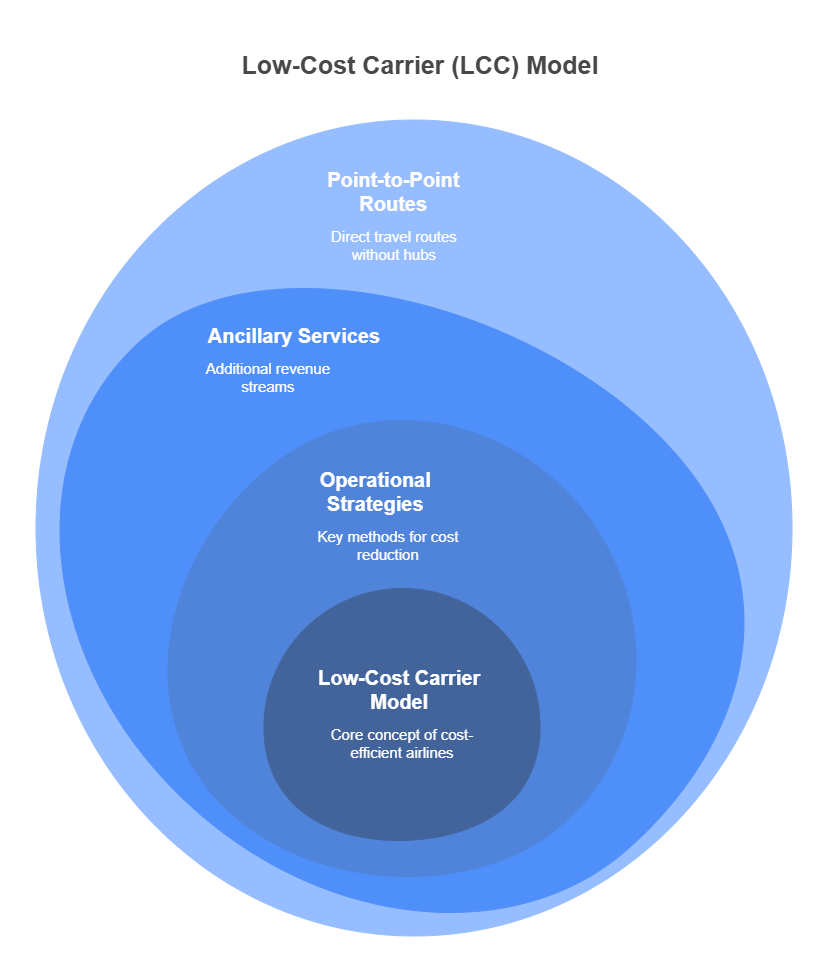 | LCC | Budget Travelers | Point-to-Point | Ticket + Ancillary Sales | Affordability & Efficiency |
