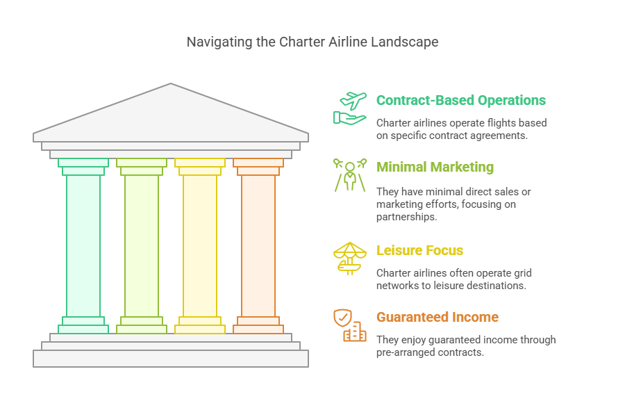Charter Airlines Charter airlines operate non-scheduled flights based on specific contracts with tour operators, corporations, or other large groups. Unlike scheduled airlines, they do not publish regular timetables or sell tickets to the general public directly. Instead, they lease entire aircraft or blocks of seats to partners who then manage passenger bookings.